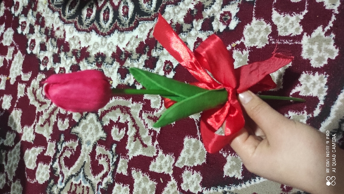The image displays a close-up, indoors scene. A single artificial red tulip is centrally held by a human hand against a patterned rug or carpet. The tulip features a vibrant red, closed flower head atop a thin green stem. Two green, fabric leaves are positioned on the stem just below the flower. A glossy red satin ribbon is tied into a bow around the stem, below the leaves. A person's hand, with fair skin and visible fingernails, grasps the lower stem of the artificial tulip. The thumb and index finger are primarily visible in the action of holding the stem. The background consists of a textile, likely a rug or carpet, with a deep maroon or burgundy base color. It features an intricate, repeating pattern of light beige or off-white abstract floral or ornamental designs, interspersed with darker outlines. A digital watermark "REDMI NOTE 9 PRO AI QUAD CAMERA" is visible in the bottom-left corner of the frame. The specific location within Pakhtakor, Uzbekistan, cannot be determined from the visual information provided in the image.