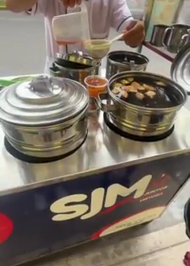 A man wearing a white chef's coat and hat stands behind a stainless-steel food cart, preparing a drink or soup. The cart is emblazoned with the letters "SJM" in large font along with other text. He pours liquids from various containers into a tall plastic cup and a stainless-steel pot on the cart. The pot contains a dark liquid with floating sliced ingredients. Other covered stainless-steel pots and metal cups sit on the cart. A busy city street is visible in the background.