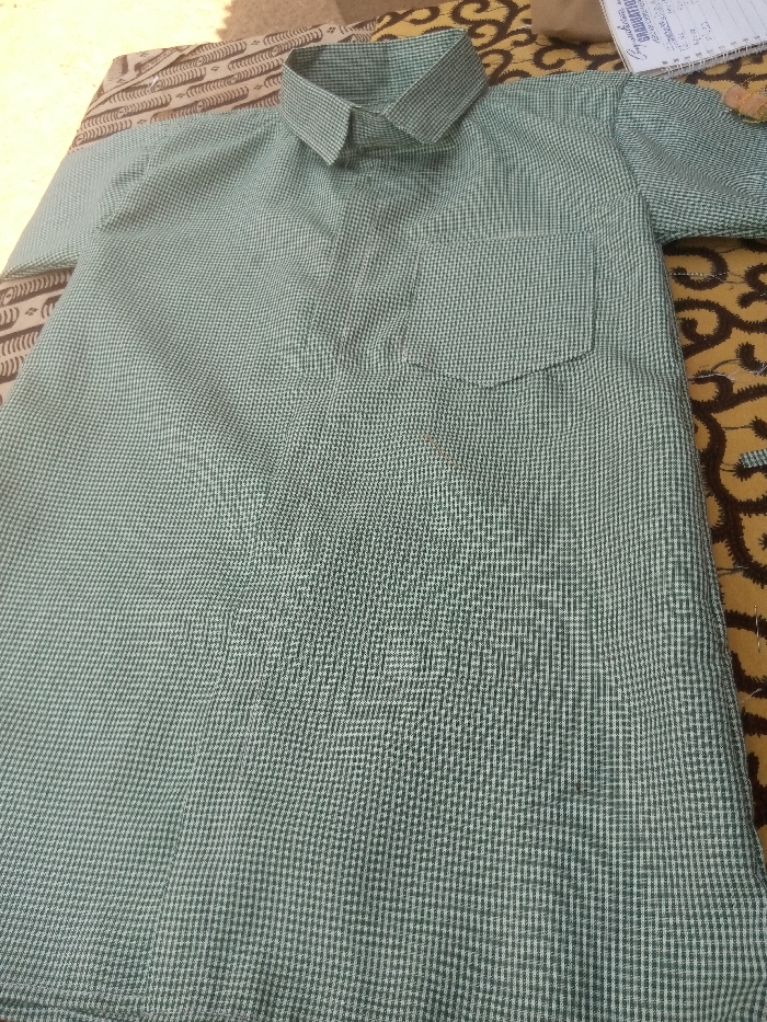 The image displays a green and white small-checkered, short-sleeved collared shirt laid flat on a patterned fabric surface. The scene is situated within the city of Gaklang, Nigeria; the specific indoor location is not discernible. **Subjects/Objects:** The primary subject is a short-sleeved collared shirt featuring a small, consistent green and white check pattern. The shirt has a visible pointed collar and a single patch pocket located on the left chest. A faint, light brown discoloration or stain, approximately 1 cm in diameter, is present on the lower front left portion of the shirt, beneath the chest pocket. The fabric of the shirt appears woven with a slightly textured finish. The shirt rests on a textile surface characterized by an ornate, flowing, abstract pattern in shades of dark brown and golden-yellow. In the upper right background, a small, rectangular piece of white paper, consistent with a notebook page, is partially visible, containing handwritten text in dark ink. **People/Actions/Interactions:** No individuals are present in the image. No actions or interactions are depicted; the objects are static. **Environment:** The scene is illuminated by ambient light, suggesting an indoor setting. The overall lighting is soft, without harsh shadows.