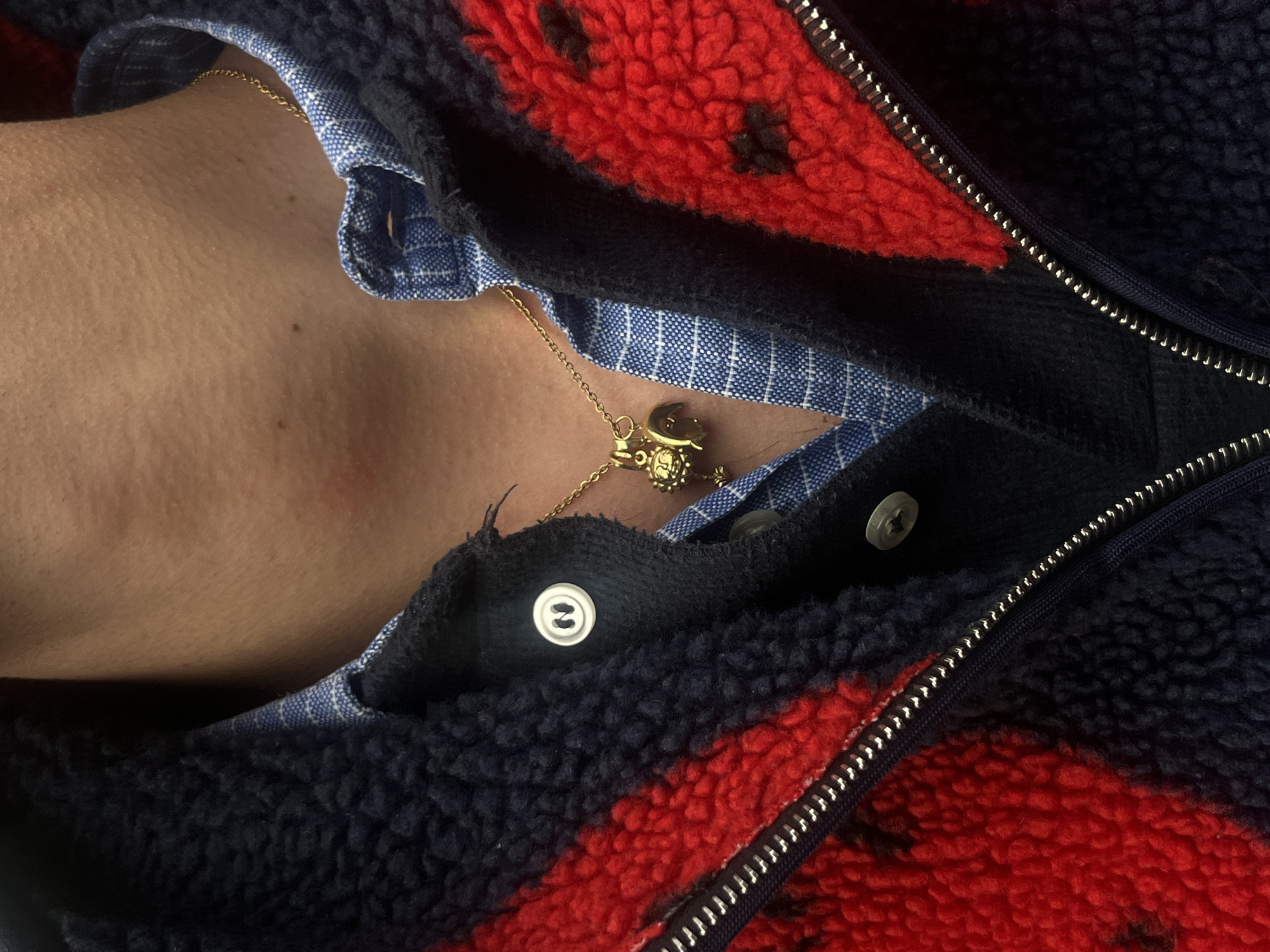 A close-up shot of a person's upper chest and neck area is visible. The person is wearing a light blue, button-down shirt with a subtle checkered pattern. Over the shirt, there's a fleece jacket or vest with a prominent red and navy blue color block design. The jacket is partially zipped, with the zipper teeth and pull visible. A gold chain necklace with a small pendant hangs around the person's neck, resting on the shirt. The skin tone of the person is light, and there are a few visible skin marks or blemishes. The image focuses on the clothing and the person's upper body, with no indication of a specific location or cityscape, including Bayonne, France.