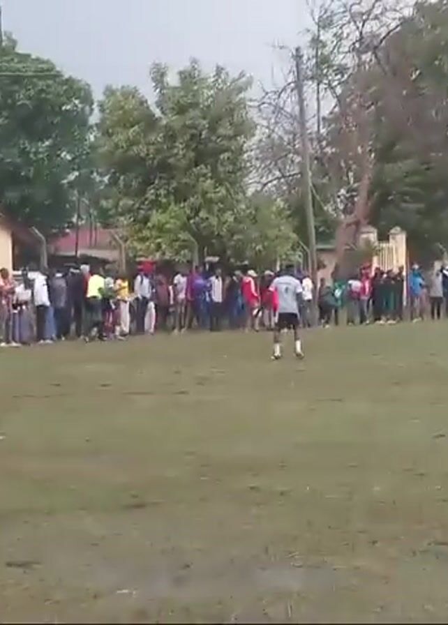 soccer game in progress on a waterlogged field. A large crowd of spectators stands along the sidelines. The players are wearing different colored jerseys, mostly red and white. One player kicks the ball down the field. There are buildings and trees in the background.