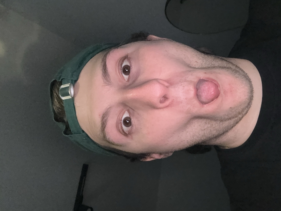 This image presents a close-up, frontal view of an adult male situated indoors within Novate Milanese, Italy. The male exhibits light skin, wide-open brown eyes, and dark hair partially covered by a dark green baseball cap worn backward, featuring a silver-colored buckle. His mouth is open in an exaggerated O-shape, with the tongue slightly protruding. His cheeks are noticeably drawn inward, creating deep depressions on either side of his face. Visible stubble is present on his chin and jawline. He is wearing a black t-shirt. The background is dimly lit, appearing dark and largely featureless, suggesting an internal room. A dark, horizontal linear object is faintly discernible in the upper left background, and a curved, lighter object is partially visible in the upper right background. The individual is directly facing the camera with a deliberate facial expression. The specific location within Novate Milanese is not identifiable from the visual evidence.