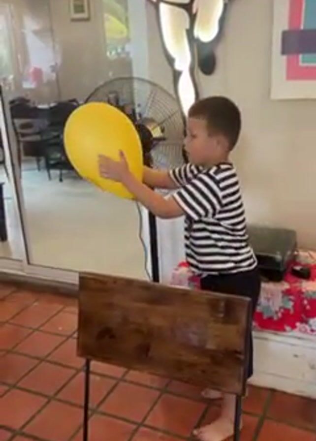 A young boy in a black and white striped shirt and black shorts is playing with a yellow balloon indoors. He's barefoot and standing on a tiled floor in what appears to be a restaurant or cafe. The boy hits the balloon upwards, and it floats closer to the camera, filling the frame. Behind him, there's a wooden chair with a cushion featuring a British flag design, an oscillating fan, and a sign with a cartoon character and text like "Feed & Beverage". A glass window with tables and chairs visible outside is also in the background. The boy appears determined and focused as he plays with the balloon.