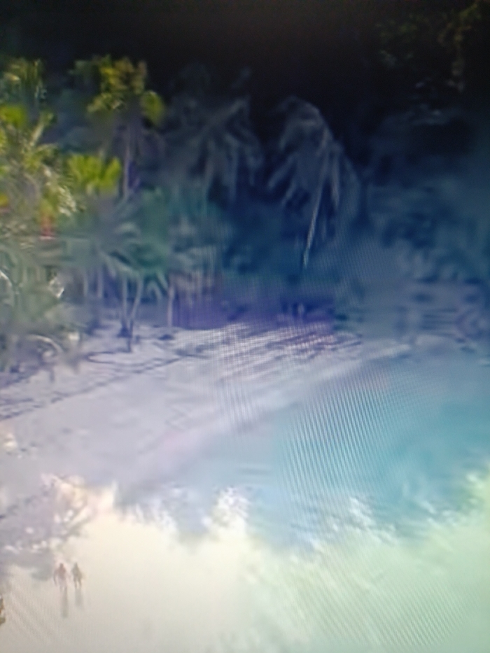 The image depicts a scene at the beach in Netanya, Israel (latitude: 32.32, longitude: 34.85). The scene shows a sandy beach with a line of palm trees in the background. Two figures, appearing as small dots, are walking along the beach. The sky is a light blue with white clouds, and the water is a light green color. The scene is blurred, giving the impression of distance and motion. The image appears to be captured from a high angle, possibly from a drone or helicopter.