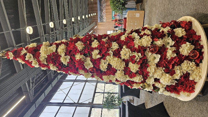 - "A large, conical decorative tree, approximately 4-5 meters tall, occupies the center of the frame, constructed from dense clusters of artificial red poinsettia-like foliage and cream-colored hydrangea-like flowers, arranged in an alternating pattern" by FM-wUp8n2, licensed under CC BY 4.0