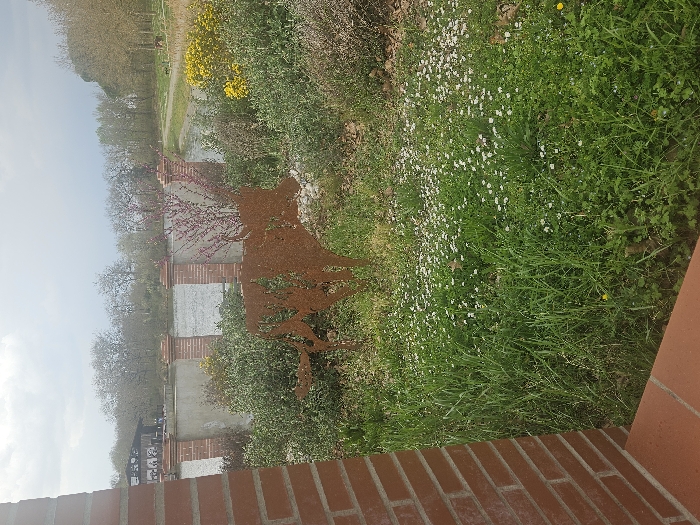 The image depicts an outdoor scene in Avignonet-Lauragais, France, under an overcast sky. The foreground on the left displays a reddish-brown brick wall and a terracotta-colored step. Adjacent to this, the ground is covered by a mixture of vibrant green grass and numerous small white wildflowers, consistent with daisies, along with a few yellow blossoms. Centered in the mid-ground, a rusted metal silhouette of an animal, resembling a wild boar or wolf, stands amidst various green shrubs and bushes. Behind this vegetation, a body of water, identifiable as a canal, spans horizontally. A low concrete wall featuring regularly spaced reddish-brown brick pillars serves as a barrier along the canal's edge. A shrub with small purple blossoms is visible near the concrete wall to the left of the metal animal silhouette. The background beyond the canal features a dense line of deciduous trees, exhibiting early spring foliage. A dark-roofed building with lighter-colored walls is partially visible through these trees on the far left bank. On the opposite bank to the right, a dirt path runs parallel to the water, and indistinct animal figures, possibly horses, are faintly visible further down the path. No human subjects are present in the scene.