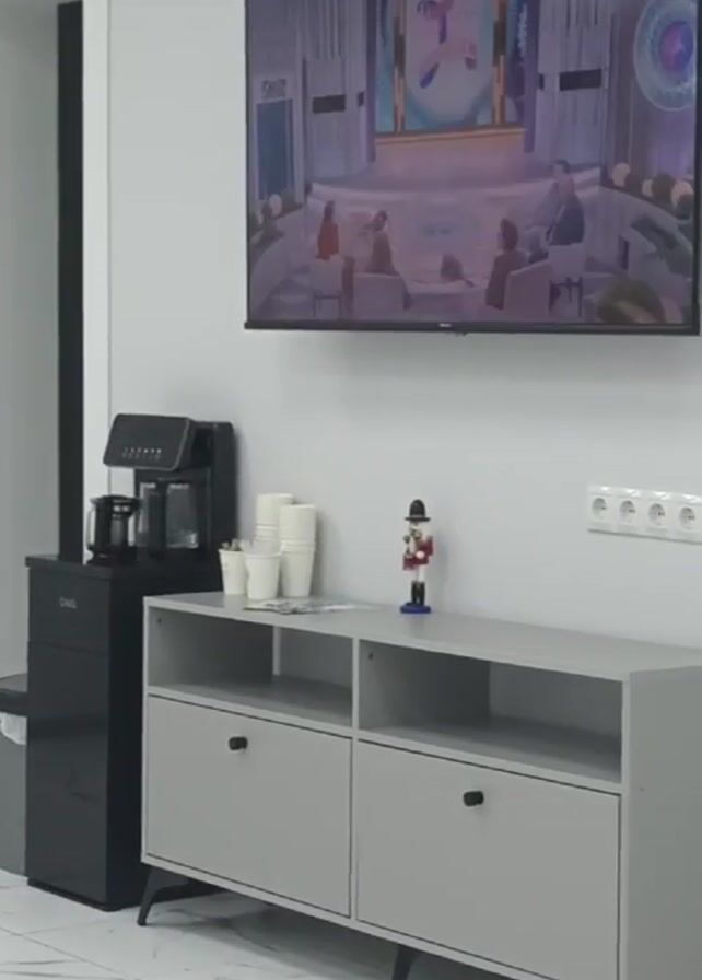 waiting area in what appears to be a medical or cosmetic treatment center. A large TV is mounted on the wall playing a talk show with people seated in a circle. Below the TV is a light gray cabinet, with a coffee maker, cups, and a nutcracker figurine on top. To the left of the cabinet is a trash can. The floor is white with gray veining. A door with a sign that reads "PROCEDURAL CABINET" in Russian is visible on the right. The walls are white.