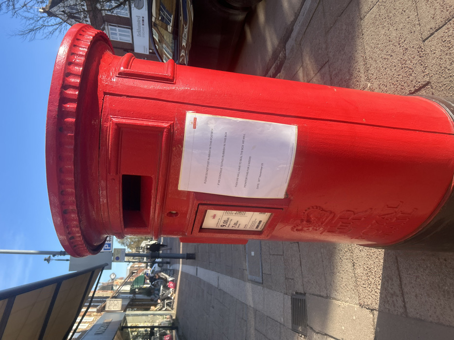 - "A red Royal Mail pillar postbox, embossed with "ER" and a crown, stands on a paved sidewalk in what appears to be Berkhamsted, within the city of Dacorum, United Kingdom" by FM-PtehC2, licensed under CC BY 4.0