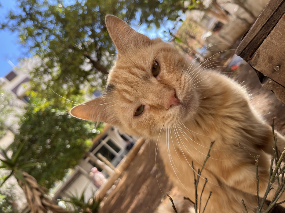 - "An orange tabby cat with greenish-yellow, partially closed eyes and prominent white whiskers is captured in a close-up, low-angle shot in an outdoor urban setting in Meknes, Morocco" by FM-1AGZJ2, licensed under CC BY 4.0