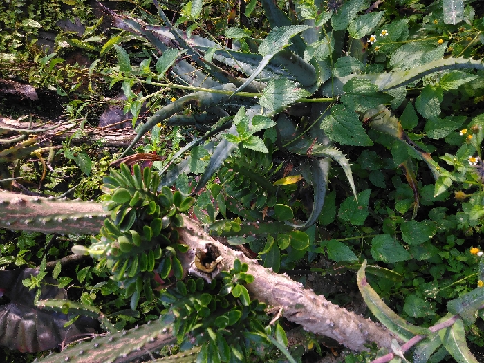 The image displays a dense botanical scene located in the city of Mouangkeo, Laos. The foreground and midground are characterized by overgrown, vibrant green vegetation. On the left, a thick, pale, gnarled stem, likely a succulent or cactus, rises vertically, featuring numerous clusters of small, rounded, stacked green leaves. A hollow section is visible within this stem. To the right, a prominent plant with thick, dark green, spiky leaves, consistent with an agave or aloe species, is partially obscured by surrounding foliage. Its leaves are pointed and exhibit distinct spines along their edges. The ground cover consists of various smaller green plants and broadleaf weeds. Tiny white and yellow wildflowers are sparsely scattered throughout the lower portion of the frame. Natural daylight illuminates the scene. No individuals, animals, or man-made objects are present.