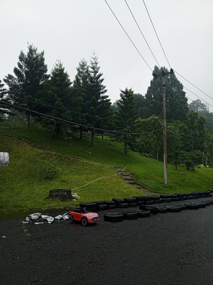 A red toy car rests beside a tire barrier on a wet asphalt surface. Behind, a grassy slope is dotted with evergreen trees and power lines overhead. Steps lead up the hill. There is a sign on the hill that is written in a language other than English. To the left, debris sits in a puddle. The day is overcast.