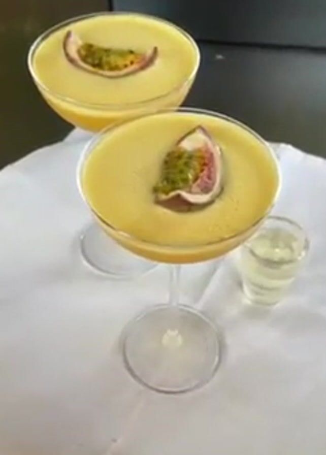 two full martini glasses, each containing a frothy yellow beverage and a half-slice of passion fruit floating on top, sitting on a white cloth. A small glass containing a clear liquid sits beside the drinks. The drinks are on a stainless steel surface next to some kitchen equipment. The camera zooms in on one of the drinks.