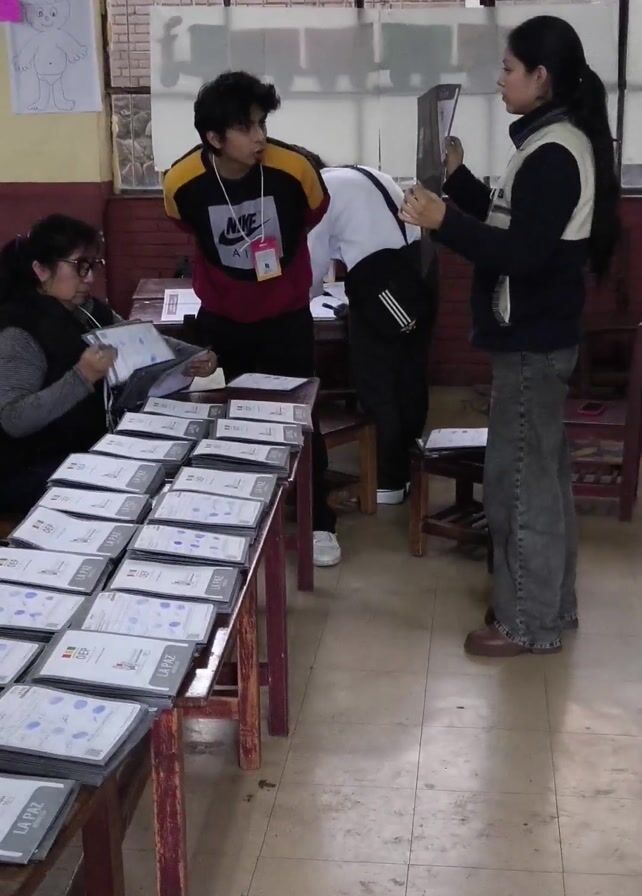 two people standing at a table covered with documents, seemingly discussing them. A third person is also present, visible in the background between the first two. The setting appears to be a room with a tiled floor and multiple tables, possibly a classroom or administrative space. Later, a person is seen pinning a large document to a wall, likely a chart or list with various acronyms or labels. The room has bookshelves and other school-related items, suggesting an educational context for the activities taking place.