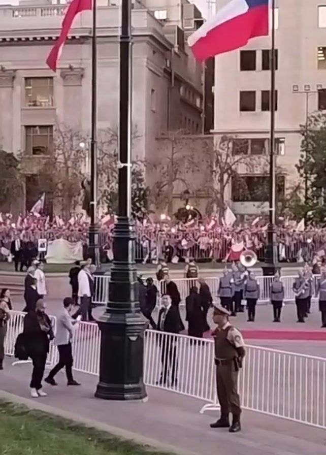crowd of people waving small Chilean flags, with a band and officials in the foreground. The flags are red, white, and blue, with a white star. The crowd is behind white fences. Behind the crowd are tall buildings. In the foreground, there is a guard in a brown uniform, and some people in suits walking by. The band members are wearing grey uniforms.
