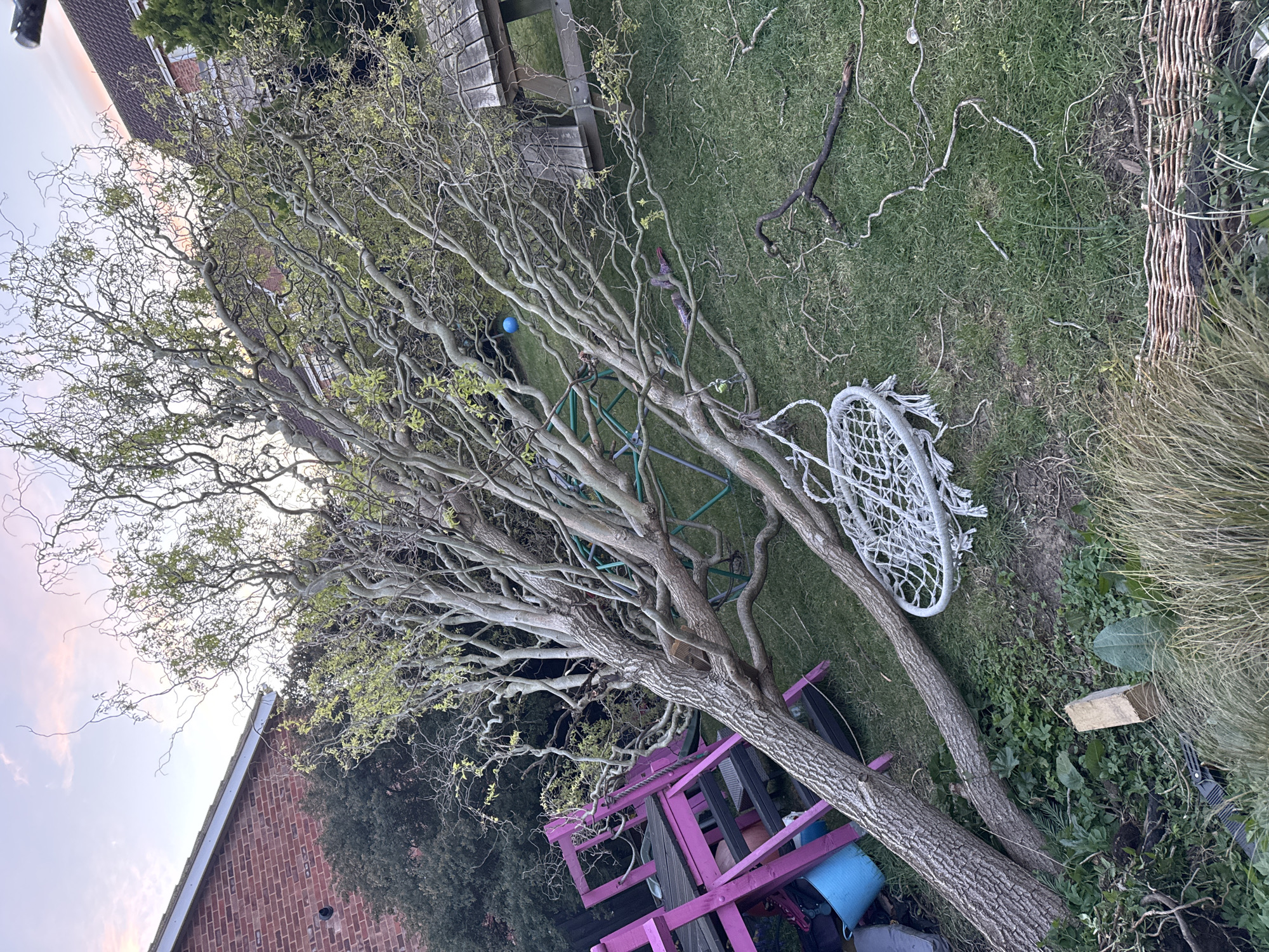 scene in a garden. A fallen tree lies across a green lawn. A pink wooden structure, possibly a playhouse or climbing frame, is partially visible at the bottom of the image. A white net swing or seat rests on the grass near the tree trunk. A green metal climbing frame is also present. The photo was taken in South Kesteven, United Kingdom.