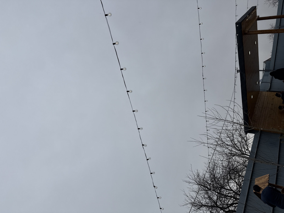 The image displays an outdoor setting in Voskevaz, Armenia, under an uniformly overcast, light gray sky. Two horizontal strings of unlit Edison-style bulbs are stretched across the upper two-thirds of the frame. Below the upper string of lights, the bare, leafless branches of several deciduous trees are visible, primarily on the left and center. A dark gray corrugated metal fence runs across the lower portion of the image. To the lower right, a wooden shelter with a dark flat roof and recessed lighting is present, featuring horizontal wooden paneling on its back wall and a wooden support column on the right. Several individuals are partially visible beneath this shelter, appearing to be seated or standing; one figure in a dark jacket is most prominent. In the lower-left foreground, a person wearing a dark long-sleeved shirt stands with their back to the camera, partially obscured by a wooden structure resembling a large birdhouse or feeder on a stand. No distinct interactions between individuals are discernible.