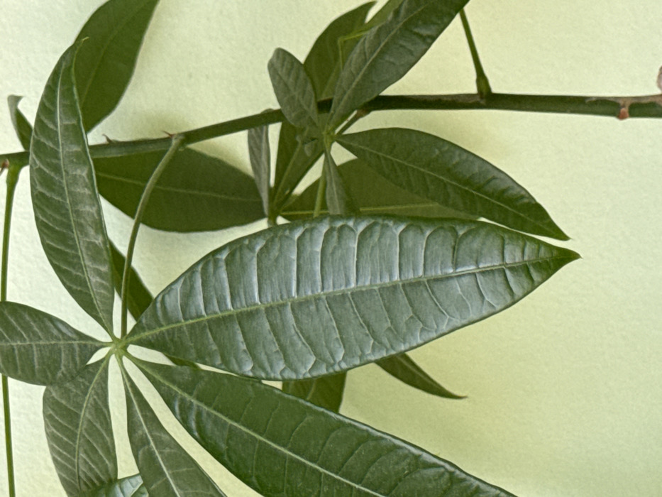 The image displays a close-up of a live plant, likely an indoor specimen, against a solid, light green wall background. The primary subjects are the plant's dark green, palmately compound leaves, characterized by prominent venation and a slightly textured, somewhat corrugated surface on some individual leaflets. Several leaflets are visible, fanning out from central points. A slender, darker green stem or branch is partially visible on the right side of the frame, with smaller leaves or emerging growths attached. No people, objects other than the plant and wall, or specific actions are depicted. The lighting is diffuse and even. The image contains no discernible features or contextual information to indicate a specific location within the city of Lovech, Bulgaria.