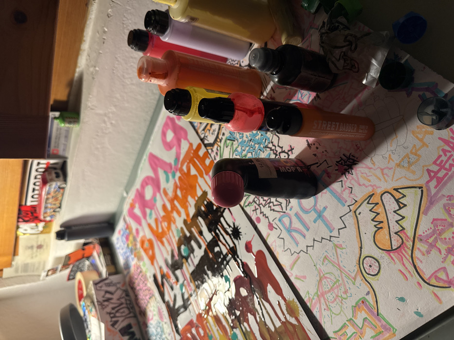 Several paint markers and open marker caps rest on a white, graffiti-covered surface