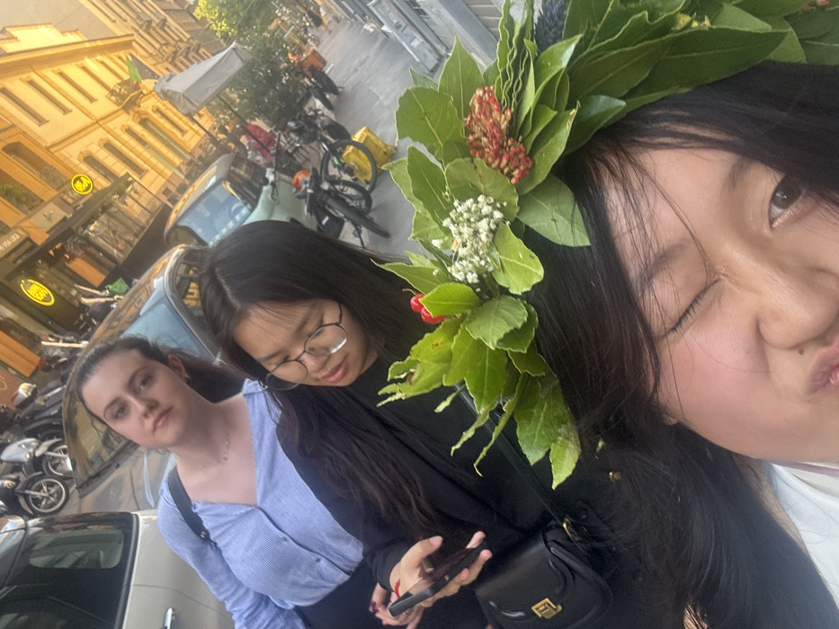 The image depicts three individuals in an urban street scene in Milan, Italy, specifically identifiable by the "Osteria da Via Vai" sign visible on a building in the background, placing the location near Via Savona 13. In the foreground, an individual is taking a selfie, evidenced by their partial face visible at the bottom, winking with one eye, and wearing a prominent laurel wreath (corona d'alloro) composed of green leaves, red berries, and small white flowers, signifying an Italian university graduation. In the midground, an individual with long dark hair and glasses is looking downwards, focused on a smartphone held in their left hand. They are dressed in a dark top, with a black shoulder bag resting on their left side. Behind and to the left, a third individual with dark hair pulled back is visible, wearing a light blue, striped, collared shirt, and looking directly towards the camera with a neutral expression. The environment is a bustling city street. Buildings with light-colored, possibly stucco, facades line the street, featuring windows and an awning belonging to the "Osteria da Via Vai." The street is occupied by various parked vehicles, including a white car, several darker cars, numerous motorcycles and scooters, and multiple bicycles, one equipped with a yellow food delivery box. The ambient lighting suggests late afternoon or early evening.