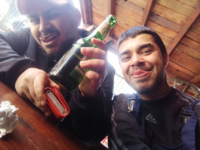 The image captures two adult males in a casual indoor or semi-outdoor setting within Sredets, Bulgaria. Both individuals are depicted in a playful manner, looking directly at the camera with their tongues extended. The male on the left wears a light-colored baseball cap and a dark jacket, holding a green glass bottle with his right hand and an open red card holder containing multiple cards with his left hand. The male on the right, with short dark hair and a beard, wears a dark t-shirt with a white Adidas logo and a dark jacket with grey stripes. A wooden table surface is visible in the foreground, with a crumpled white paper item to the left. The background features a wooden ceiling structure with exposed beams and some metallic elements, suggesting a restaurant, bar, or covered patio environment.