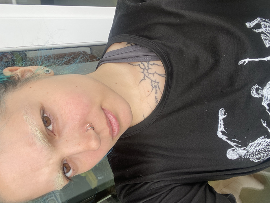 A female individual is depicted in a close-up, waist-up portrait. She has blue/teal hair, bleached blonde eyebrows, and brown eyes, with her forehead slightly furrowed. A double silver hoop piercing is present in her left nostril, and a silver circular piercing is visible in her left earlobe. She wears a black short-sleeved t-shirt featuring a white graphic print of stylized skeletal figures on the lower front. A dark gray undergarment strap is visible beneath the t-shirt on her left shoulder. Tattoos are present on her upper left chest, including a web-like pattern and the text "SOFT INSIDE". The background is out of focus, showing indistinct light and dark areas consistent with an indoor or semi-enclosed setting with ambient light. The scene is located in Gijón/xixón, Spain.