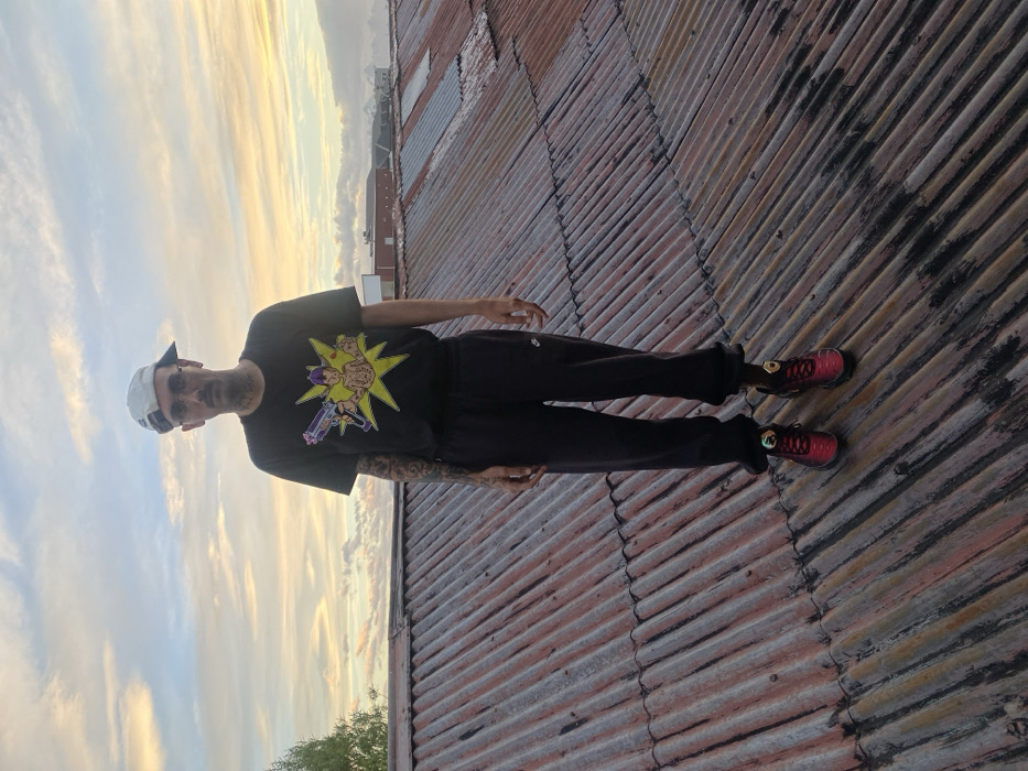 A man stands on a corrugated rooftop, positioned diagonally in the frame. He wears a black t-shirt with a cartoon graphic, black sweatpants, and red sneakers. A baseball cap sits backwards on his head. The background shows a cloudy sky near dusk. The corrugated material dominates the scene, and it is mostly silver, with some brown patches.