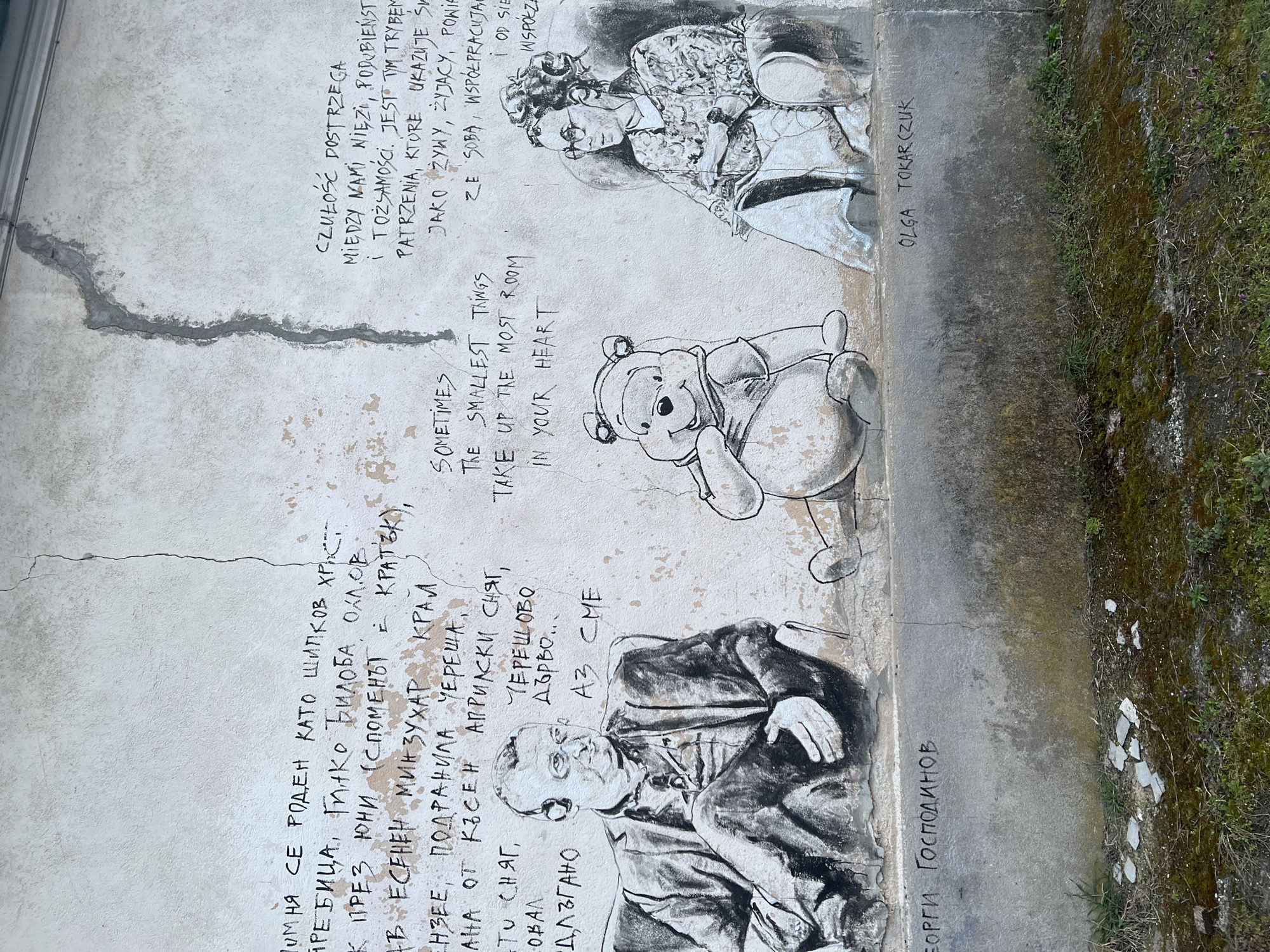 The image captures a section of graffiti art on a weathered wall in Staro Zhelezare, Bulgaria. The mural is divided into three main sections, from bottom to top: 1. **Bottom Section:** A charcoal-style drawing of Georgi Gospodinov is accompanied by Cyrillic text (Bulgarian), including the name "Georgi Gospodinov" written underneath the portrait. The text above the portrait appears to be a poem or short excerpt. 2. **Middle Section:** A simple illustration of Winnie the Pooh appears, next to the English phrase, "Sometimes the smallest things take up the most room in your heart." 3. **Top Section:** A charcoal drawing of a woman appears, with Polish text above her. To the right of the woman is the name, "Olga Tokar(zuk)". The wall is old, with signs of wear, including cracks that appear to have been filled. Moss is growing along the base of the wall on the right side of the image. The overall scene suggests the street art is located in a public space.
