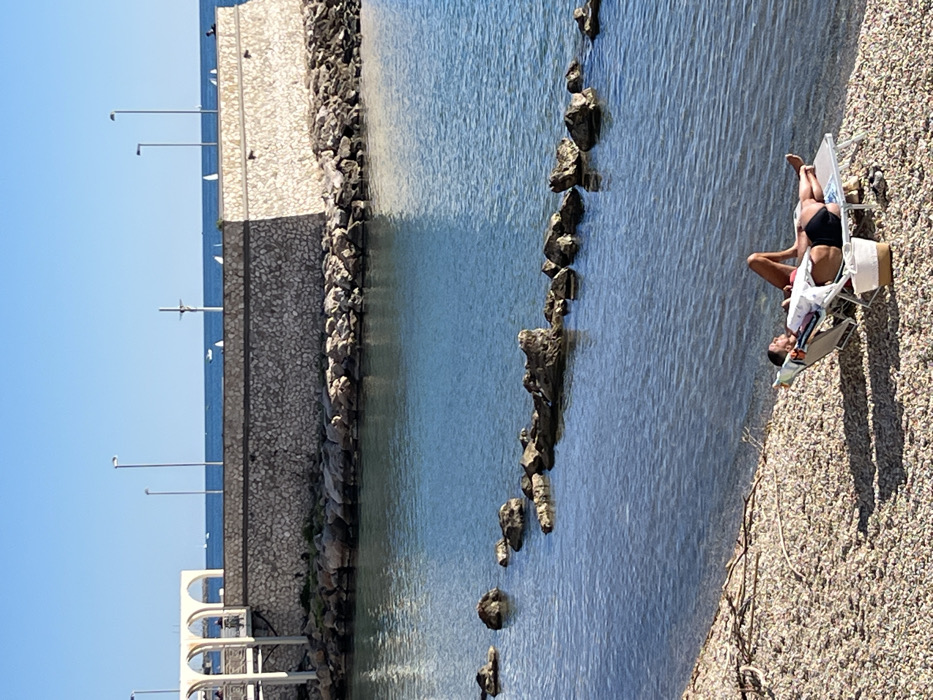The image displays a sunny coastal scene in Civitavecchia, Italy, featuring a person relaxing on a pebble beach in the foreground. In the lower right, a female individual with short dark hair lies supine on a light-colored reclining beach chair. She wears dark bottoms and a light-colored open shirt over a lighter top, with her arms crossed over her stomach and knees bent. A light-colored woven tote bag with brown straps rests on the gravel next to the chair, and a magazine or book is visible on the chair beneath her arm. The beach consists of small gray and tan pebbles, with some driftwood branches visible on the left. The midground features calm, blue-green water. A line of natural rocks partially submerged and breaking the surface extends from the mid-left towards the lower center. Beyond the water, a robust seawall or pier constructed from rough-hewn stone forms a barrier, topped with a lighter, smooth concrete cap. Multiple tall streetlights are evenly spaced along the top of this wall. On the far left, an elevated white structure with several arches is visible, and two indistinct figures are present on its walkway. To the right of the arched structure, a white pole with a horizontal crossbar (possibly a navigational aid) stands on the seawall. On the far right end of the seawall, a small, dark figure is seated. The background shows a clear, bright blue sky meeting the open sea at the horizon. Scattered across the distant water are numerous small white sailboats and one small dark motorboat.