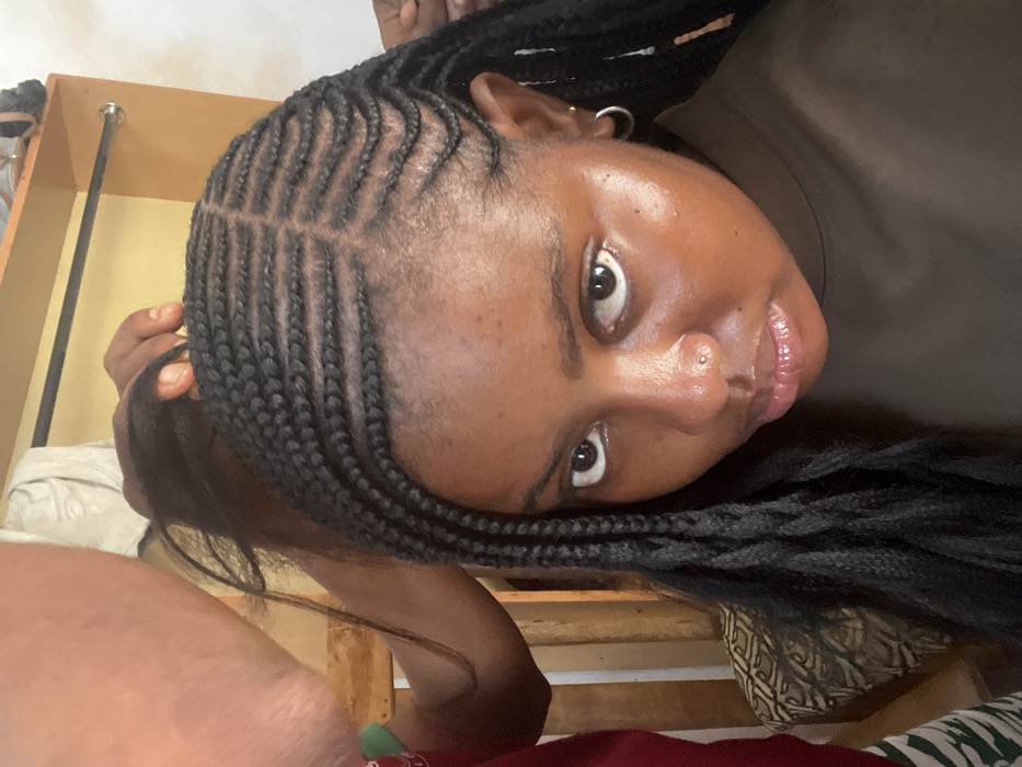 In Gbongan, Nigeria, a close-up image captures a female individual receiving hair services. The primary subject is a young Black woman with dark skin, positioned facing slightly upwards and directly towards the camera, her gaze intent. Her black hair is undergoing a braiding process; the left side of her head (viewer's right) features several neatly executed cornrows running from front to back, curving along the scalp. The right side of her head (viewer's left) shows less completed braiding, with an individual's hands visible in the upper left section of the frame, actively braiding strands of the subject's hair, incorporating extensions. This second individual, partially obscured, has lighter skin and wears a red garment with a visible green trim. The subject has a small silver nose piercing on her left nostril, a silver hoop earring in her left earlobe, and a small gold stud in her right earlobe. She wears a dark, possibly olive green, high-neck top. The background includes a light-colored wall, a wooden surface with a patterned fabric behind the subject's left shoulder, and an upper shelf with a silver rod and indistinct objects in the top right corner.