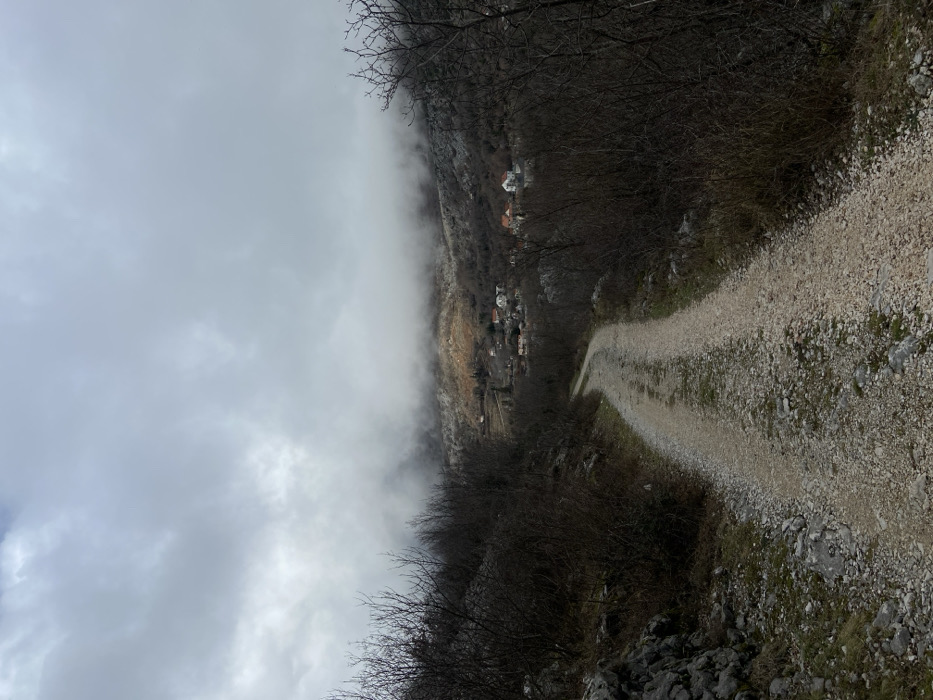 The image displays an overcast, foggy, mountainous landscape, likely situated in Brajici, Montenegro. A light-colored gravel road, composed of small stones and dirt, dominates the foreground and extends into the midground, curving gently left as it descends. On either side of the road, sparse, bare deciduous trees and shrubs with dark branches are visible, along with rocky terrain and patches of green grass. In the midground, a small cluster of residential buildings, characterized by light-colored facades and red-tiled roofs, forms a village nestled within a valley. The surrounding hills are heavily vegetated with bare trees and shrubs, with some areas of exposed rock. The background features more hills partially obscured by a thick layer of white and grey fog or low clouds, which also fill the sky above. A segment of an upper hillside is illuminated by what appears to be a break in the cloud cover, revealing reddish-brown earth. No individuals, vehicles, or animals are visible. The scene suggests a cold season due to the bare vegetation.