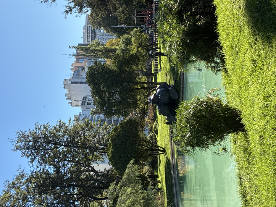 A bronze sculpture rests on the lawn of a park, juxtaposed with a body of green water and a thick patch of green plants. Buildings are visible in the background, against a blue sky. Trees populate the landscape, creating varied textures and depths. The scene is bathed in sunlight, enhancing the green tones of the park.