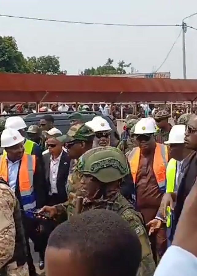 large group of people gathered outdoors. Many of them are wearing white hard hats and/or high-visibility vests. Some individuals are in military attire. A few people in the crowd are holding up their phones to record the scene. In the background, there is a building with a sign on it, and a covered walkway supported by posts. The camera moves slightly, providing different perspectives of the crowd. The overall impression is that this is some sort of official visit or event.