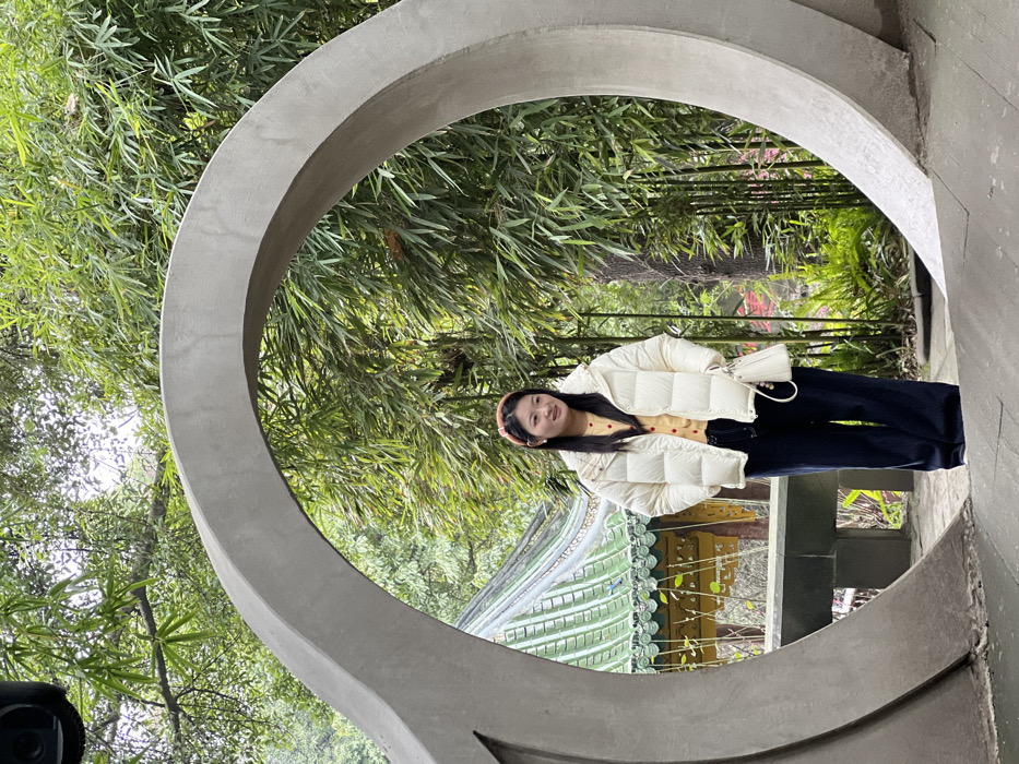A young woman wearing a beige puffer jacket and dark jeans stands within a circular stone frame, creating a natural portrait. Lush green bamboo and other foliage form the backdrop. Partially visible through the frame is a traditional Asian building with a green tiled roof. The setting suggests a park or garden with cultural significance. The composition emphasizes nature and architecture through an artistic framing device.