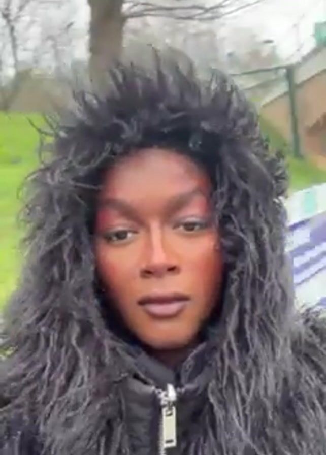 A person with dark skin and bold, stylized makeup is standing outside in an urban environment. The person is wearing a black hooded jacket with a shaggy faux fur trim around the hood. The person is looking directly at the camera with a neutral expression. The background includes trees, a grassy area, and a bridge or overpass structure. The sky is overcast and the lighting is muted, suggesting a cloudy day. The person appears to be standing still while recording a video.