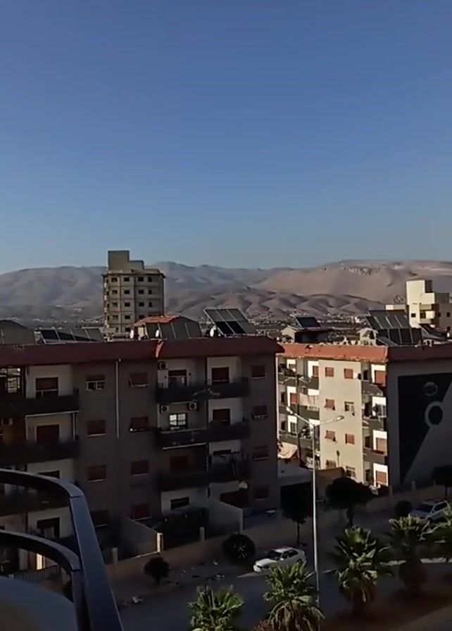 The video depicts a neighborhood scene in an urban or suburban setting. Several multistory residential buildings are visible, with terracotta-colored roofs and dark grey or brown facades. Many of the rooftops feature solar panels. Palm trees line a street in the foreground, with parked cars visible along the roadside. In the background, a mountain range can be seen under a clear blue sky. The video is taken from a high vantage point, likely a balcony, as part of the railing is visible in the lower left corner of the frame.