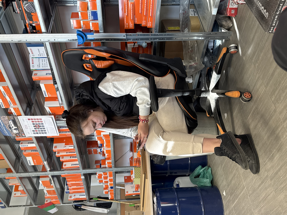 The scene depicts an interior view of what appears to be an auto parts establishment in Sliven, Bulgaria