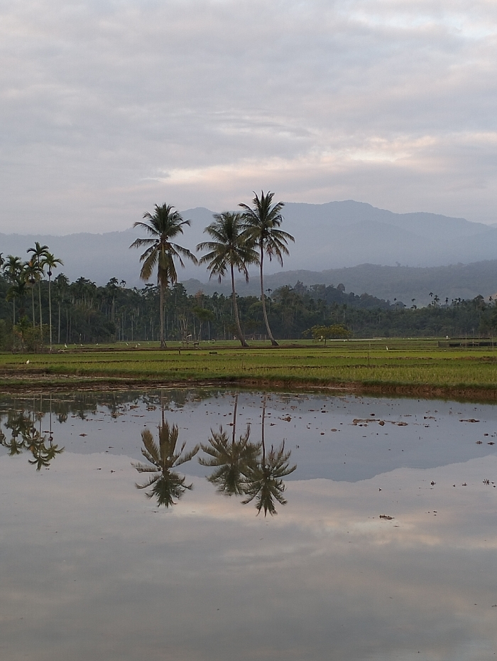 A serene landscape shows a flooded field reflecting the sky and nearby foliage. Several tall palm trees stand in the middle ground, mirrored in the still water. Beyond the field, dense vegetation rises towards misty mountains under an overcast sky. The overall palette is subdued, with muted greens, grays, and blues dominating the scene.