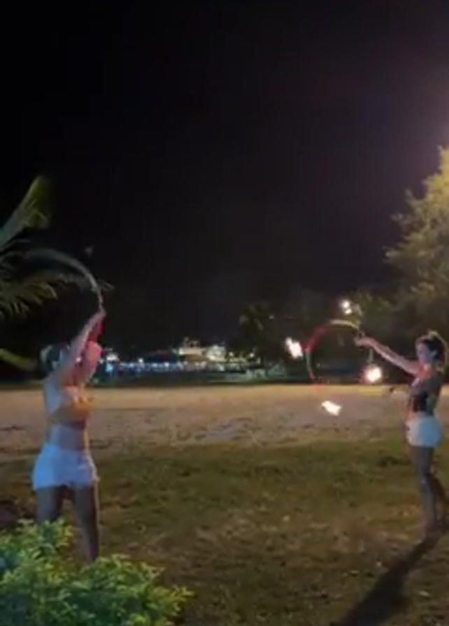 Two women perform with fire at night. One woman spins a flaming hoop over her head. The other spins two lit batons. They are on a grassy area adjacent to a beach, which is illuminated by lights in the background. A lamppost illuminates the scene. Palm trees are also visible.
