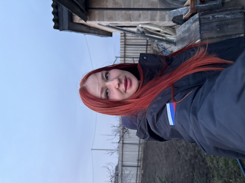 A female individual with long, straight, vibrant red hair and a nose (septum) piercing is captured in a direct-to-camera photograph, likely a selfie, outdoors in Makiivka, Ukraine