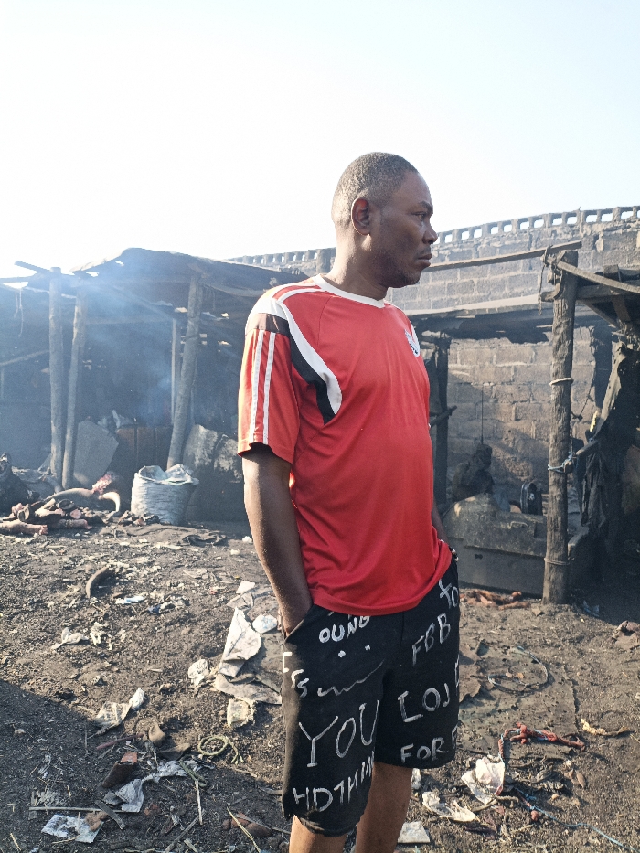 A male subject stands in the foreground, oriented in profile facing right, with hands in the pockets of his black shorts, which are marked with white text including "YOUNG", "YOU", and "NOTHING". He wears a red short-sleeved shirt with white and black shoulder stripes. The background features a landscape of partially destroyed structures, characterized by charred wooden posts, corrugated metal sheets, and exposed brickwork. Smoke or haze rises from these structures. On the ground to the left of the subject, multiple animal carcasses or butchered meat portions are visible, alongside a large, light-colored woven sack. The ground is dirt, strewn with various debris. A concrete barrier with a slotted design, indicative of a bridge or elevated walkway, is visible above the damaged structures in the mid-ground. The scene is illuminated by direct sunlight. Location: Fagge D2, Nigeria.
