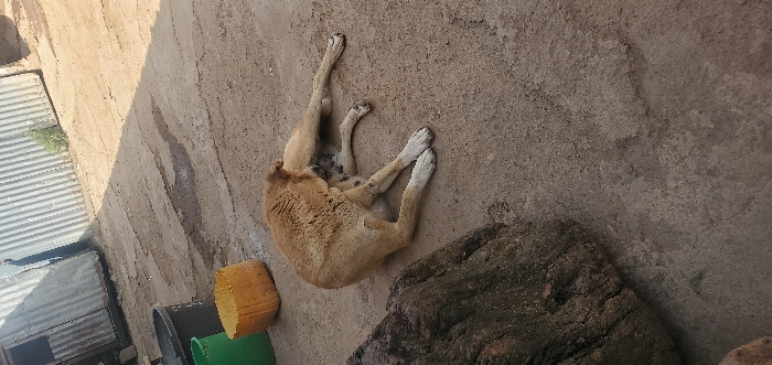 - "The image captures an outdoor scene in Jos, Nigeria, depicting a light-brown dog with white paws lying on its left side on a dusty, light-brown ground" by FM-wiHtw1, licensed under CC BY 4.0