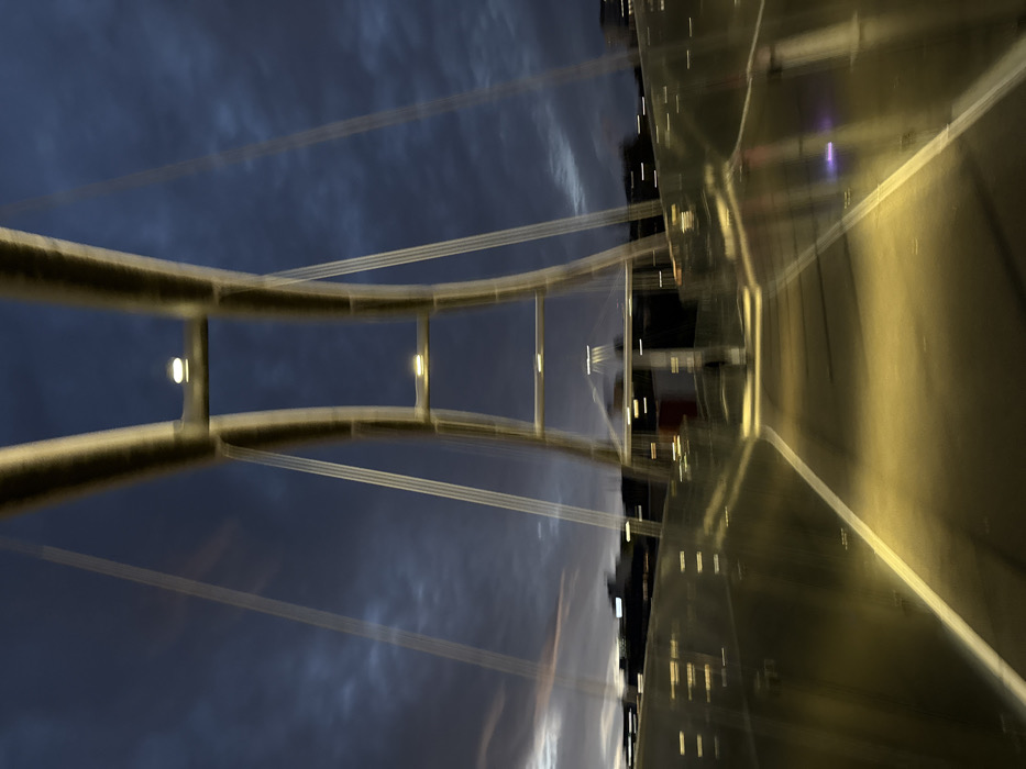 This image depicts the pedestrian bridge connecting Dundee Railway Station concourse to the city's waterfront in Dundee, United Kingdom, observed during a low-light condition. The entire scene exhibits significant motion blur, suggesting camera movement or a long exposure. The bridge's structure is prominently featured, characterized by two parallel, light-colored steel arches arching overhead. These arches are internally lit with yellowish lights, and multiple slender suspension cables descend from them to support the bridge deck. The pedestrian pathway on the bridge is brightly illuminated by yellow artificial light, emphasizing a central white dividing line. Transparent or reflective barriers run along both sides of the pathway. The background consists of a dark blue, heavily clouded sky. Blurred urban structures and distant artificial lights are faintly visible beneath the bridge arches on the horizon. No individuals or specific actions are discernible within the frame.