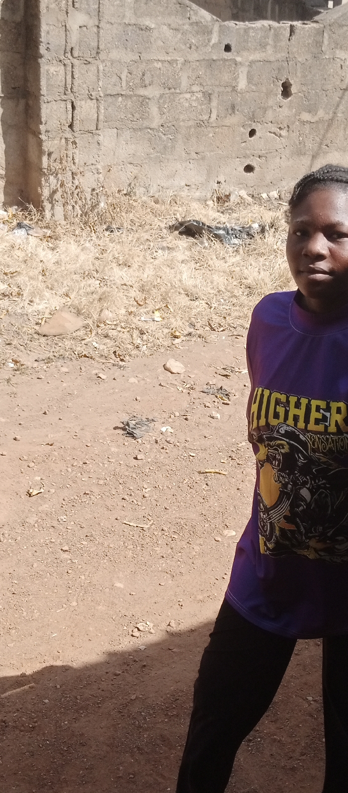 An outdoor scene in Akwanga, Nigeria, depicts an individual and their immediate surroundings. The subject, a person with dark skin and braided hair, occupies the right side of the frame, facing slightly left towards the camera. They are wearing a purple short-sleeved t-shirt with "HIGHER" printed in yellow text on the chest, beneath which is a graphic of an armored gorilla-like figure. Black pants are visible from the waist down. The ground is composed of reddish-brown dirt, interspersed with patches of dry, light-brown grass, small stones, and scattered debris including black plastic fragments and other refuse. In the background, a light grey concrete block wall, constructed from rectangular blocks, exhibits weathering and multiple small, dark circular holes. Dry vegetation is visible at the base of the wall. The scene is illuminated by strong, natural daylight, casting subtle shadows on the ground.
