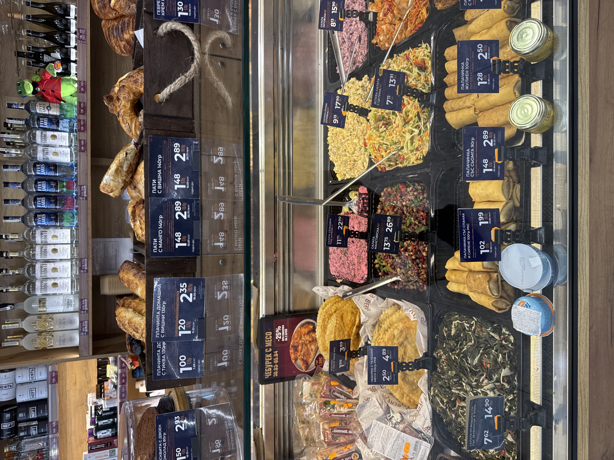 This is a photograph taken inside a grocery store, likely in Sofia, Bulgaria. The image focuses on a refrigerated display case filled with various prepared foods. The case contains salads (such as carrot and celery), chebureki (meat pastries), and blini (pancakes) with different fillings like salmon, spinach, and julienne. Each item has a price tag showing the cost per kilogram, written in Bulgarian currency (лв). Behind the display case, shelves are stocked with alcohol, including vodkas and wines. A stuffed frog toy is perched among the liquor bottles. The overall scene suggests a typical grocery store environment with a focus on ready-to-eat meals.