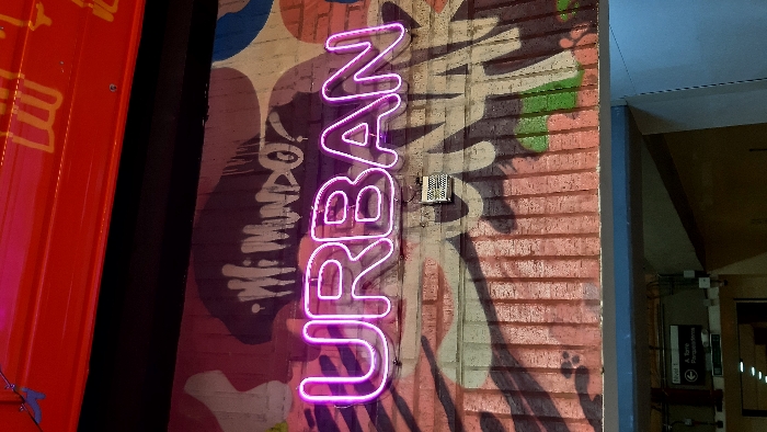 A bright pink neon sign spelling "URBAN" is prominently displayed on a graffiti-covered concrete wall