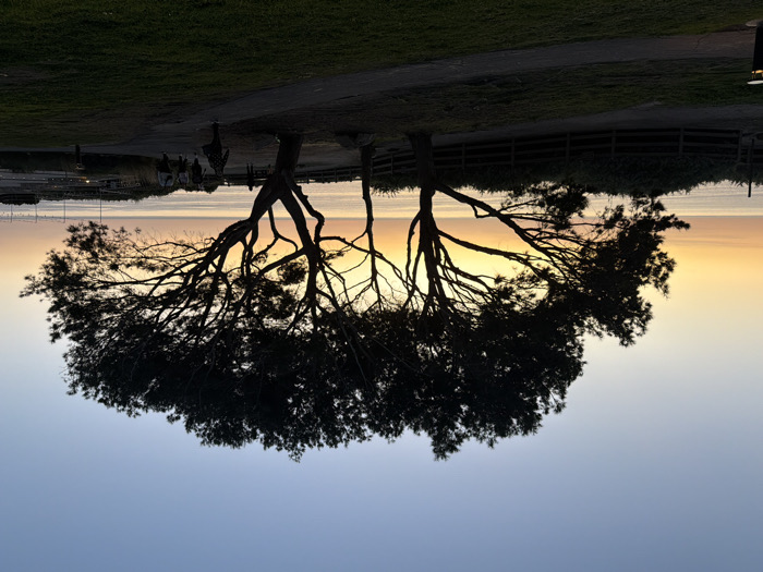 The inverted image shows two silhouetted trees against a blurred sunset sky. The trunks are slender and branch out in intricate patterns. Above the trees is a strip of land with indistinct figures walking along a path. A low wooden fence and some greenery are also visible. The sky transitions from a pale blue at the bottom to a warm yellow-orange at the horizon.