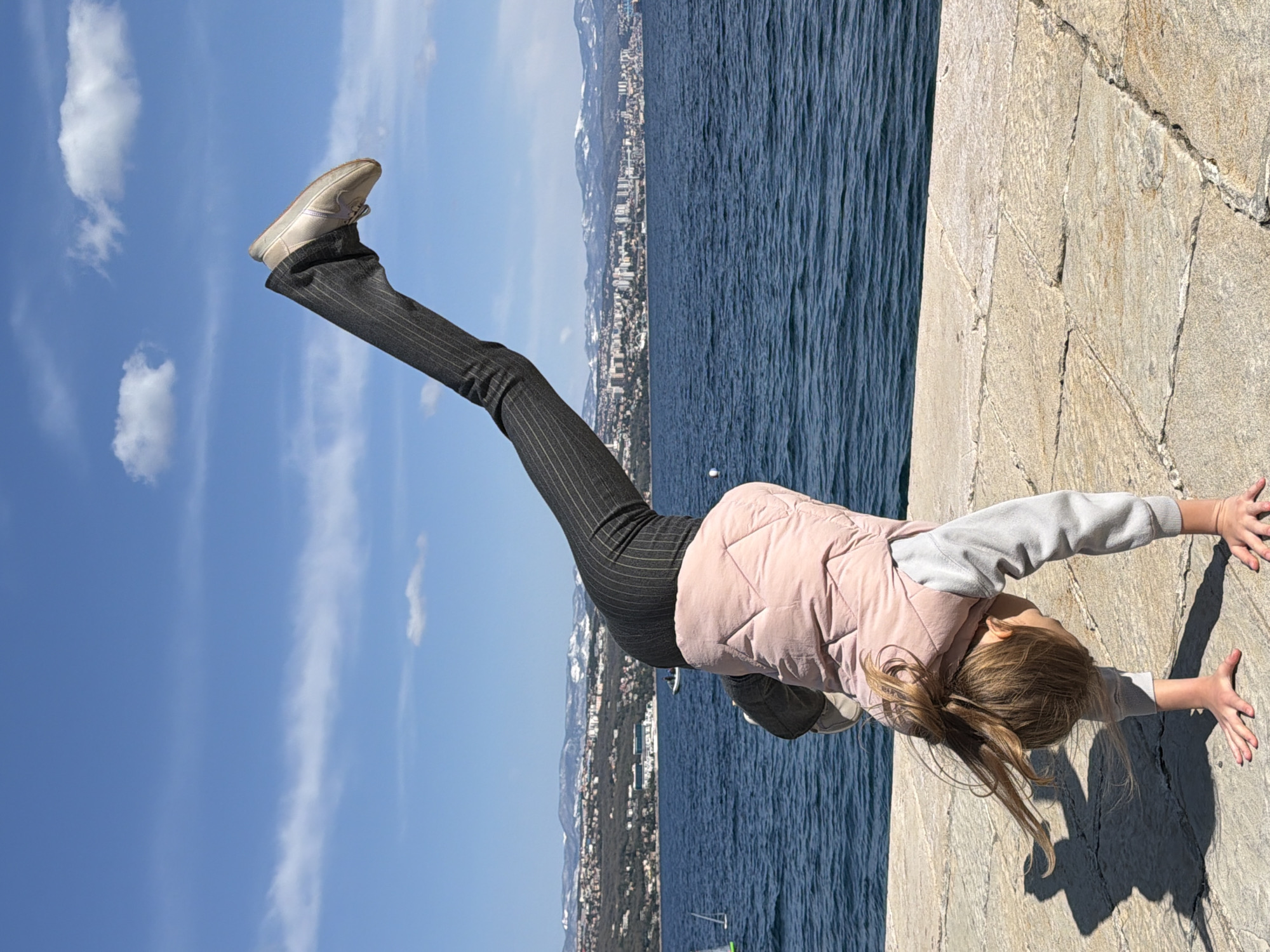 A young individual is captured mid-action performing a handstand on a light-colored, irregularly paved stone pier under a clear blue sky with sparse, wispy white clouds. The person, with light brown hair, is dressed in a light grey long-sleeved shirt, a pink quilted vest, dark grey pinstriped trousers, and light-colored shoes. Their hands are planted firmly on the pier, and their body is inverted with legs extending upwards, slightly bent at the knees. A distinct shadow of the individual is cast to their left. The scene is set on the coast of Grad Opatija, Croatia, overlooking the Kvarner Gulf. In the midground, the dark blue sea shows small ripples, with a small white sailboat with a green sail visible to the left, and a white motorboat with two occupants further out. The background features a distant urban cityscape, likely Rijeka, situated on the opposing coastline, backed by a range of snow-capped mountains, consistent with the Učka mountain range.