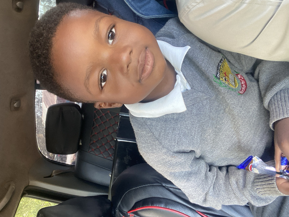 A young Black child, likely male, with short dark hair and dark eyes, is seated in the back of a vehicle