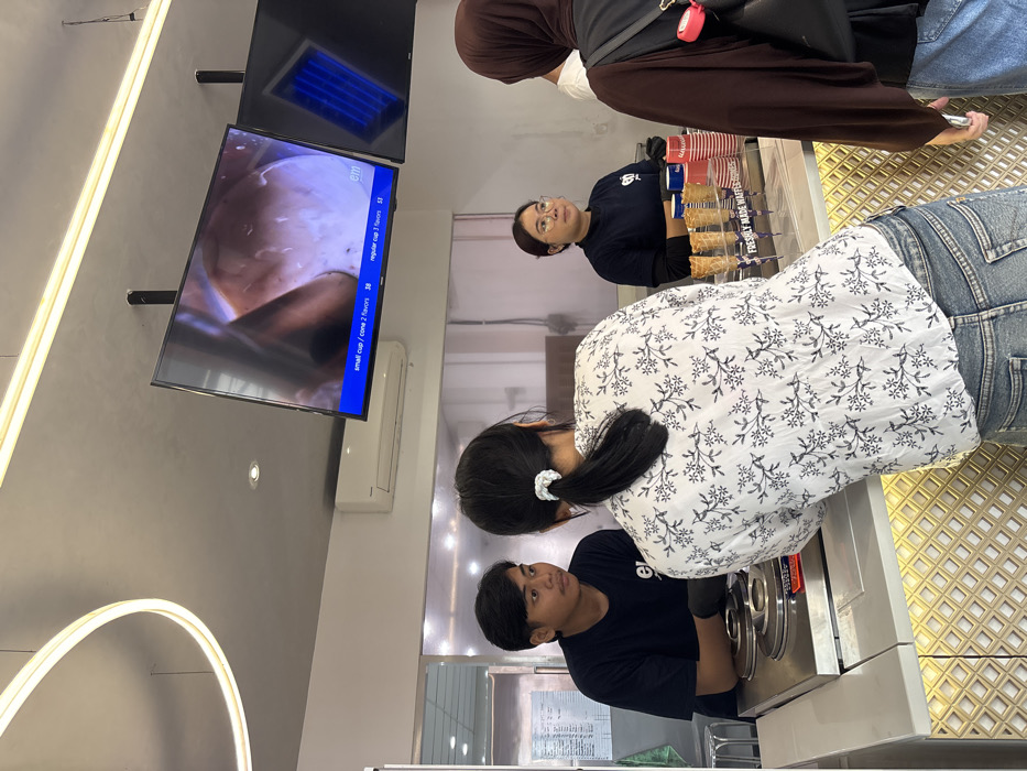 customer service counter in an ice cream shop located at the coordinates -6.244, 106.799 in South Jakarta, Indonesia. Three customers are standing at the counter while a female employee assists them. Two television screens are displaying information about the different ice cream options available, one shows a close up of ice cream being made, and the other displays the prices for different size cups and cones. The customers are dressed in casual clothing. The counter has a white countertop with a gold and white tiled front. There are three empty waffle cones on the counter along with a sign reading "Freshly Made Waffle Cones." The scene is set in an indoor space with a white ceiling, and white walls. There are some black metal pipes visible on the ceiling. The lighting is bright and there is a large window behind the counter that allows natural light to shine through. The scene is quiet and orderly, with a sense of calmness and casualness.