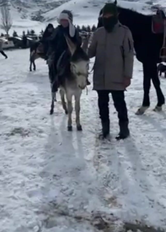 A young child sits on a small donkey in a snowy landscape with mountains in the background. An adult man stands next to the donkey, gently placing a hand on its back. A dark-colored horse is positioned behind the man and donkey. Other people and vehicles are visible in the distance. The child is wearing a hat and winter clothing, while the man is wearing a light-colored jacket, dark pants, and a face covering. The ground is covered in snow, with some darker patches of dirt or grass showing through.